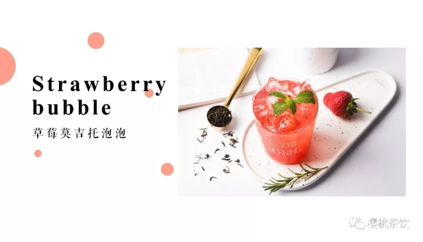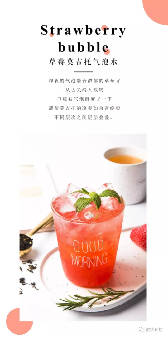 薄荷莫吉托糖漿和炸裂的氣泡水迸發出夏季特有的清涼,草莓透過細密、豐盈的氣泡露出嬌羞的粉色和濃郁的草莓香。